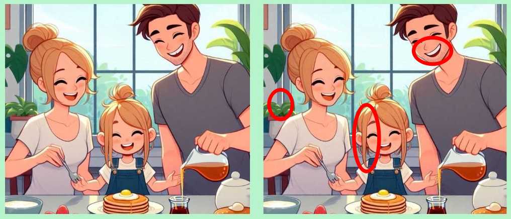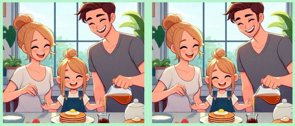 This spot the difference challenge features two identical pictures of a family at breakfast table. Although the two images look identical at first glance, they are not. There are three differences between the two pictures.