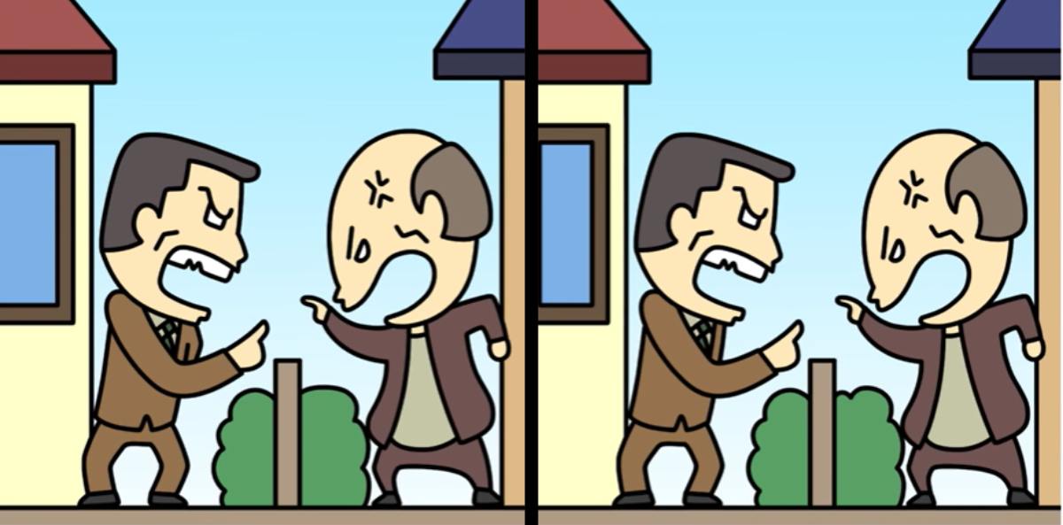 The image above depicts two identical pictures where you can see two neighbours fighting. Although the images are nearly identical, there are 3 differences between them. Can you find them all in 15 seconds?
