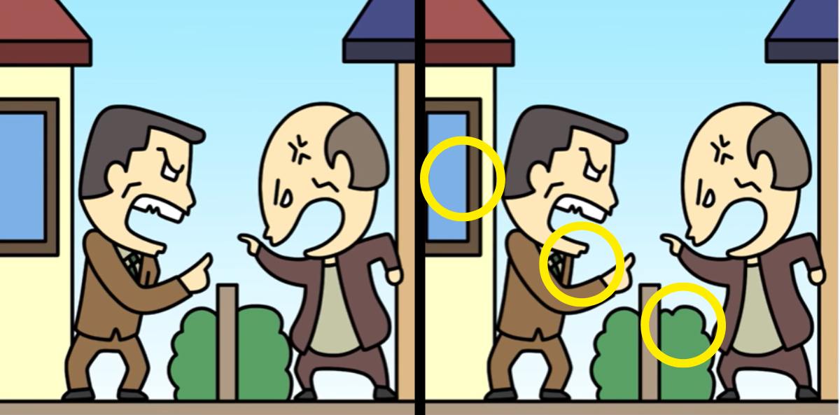 If you were unable to spot the differences between the fighting neighbours' picture in 15 seconds, you can see the solution below.