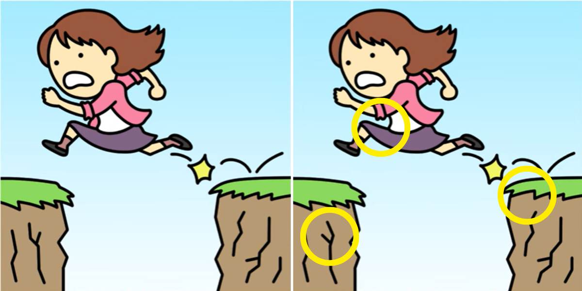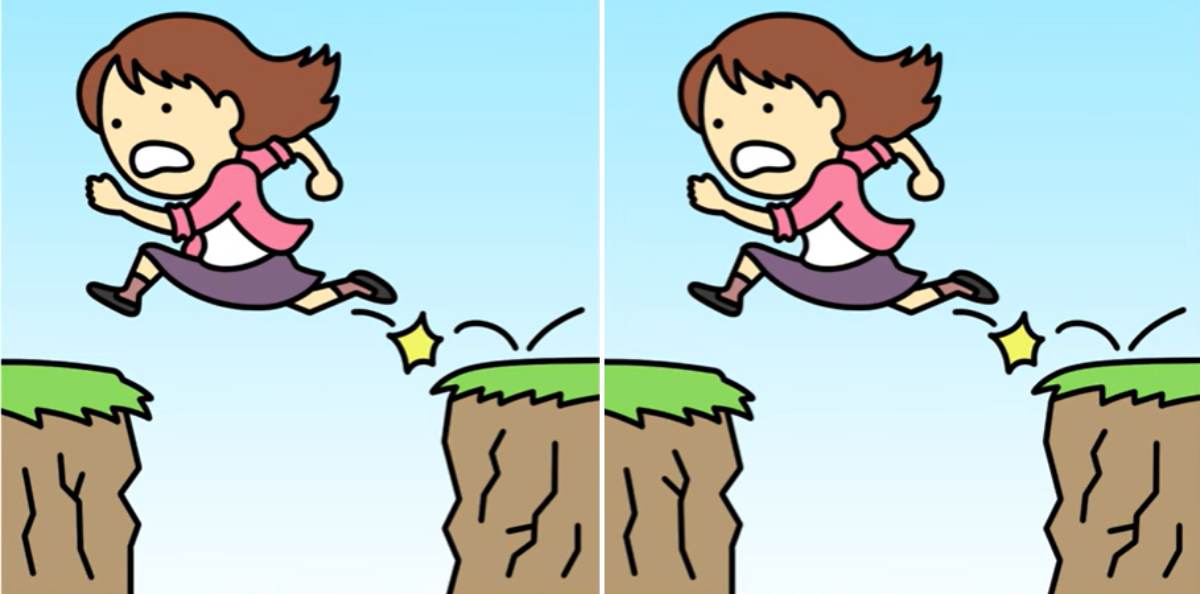The image above depicts two identical pictures where you see a woman. The woman is jumping off one cliff to another. Although the images are identical, there are 3 differences between them. Can you find them in 12 seconds?