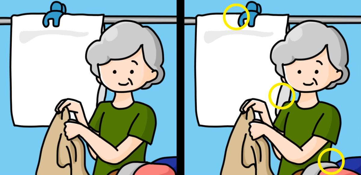 The image above depicts two identical side-by-side pictures where you can see a grandma drying clothes. Although the images are nearly identical, there are 3 differences between them. Can you find them all in 12 seconds?