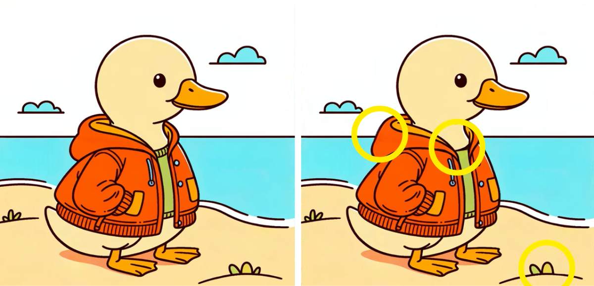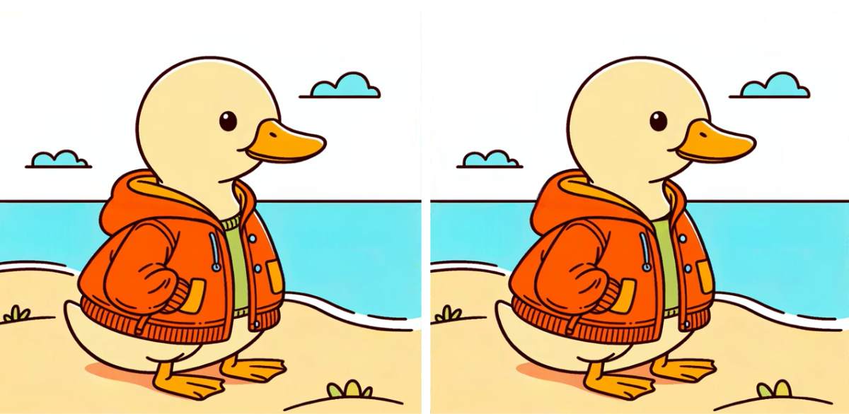 The image above depicts two identical side-by-side pictures where you can see a duckling wearing a jacket and walking on the shore. Although the images are nearly identical, there are 3 differences between them. Can you find them all in 8 seconds?
