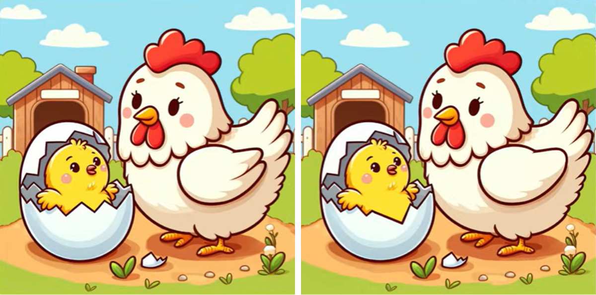 The image above depicts two identical pictures where you can see a hen and a hatchling. They are outside a chicken coop and it looks like the chick has just hatched from its egg.. Although two images are nearly identical, there are 3 differences between them. Can you find them all in 12 seconds?