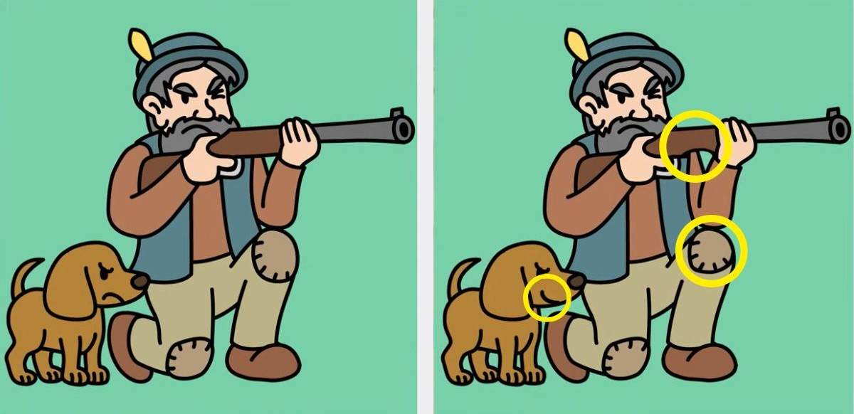 You were asked to spot differences between the two pictures of a hunter and his puppy. Here is the solution to this spot the difference puzzle game: