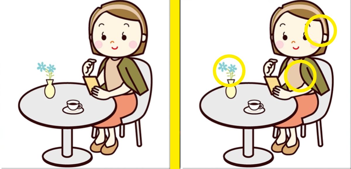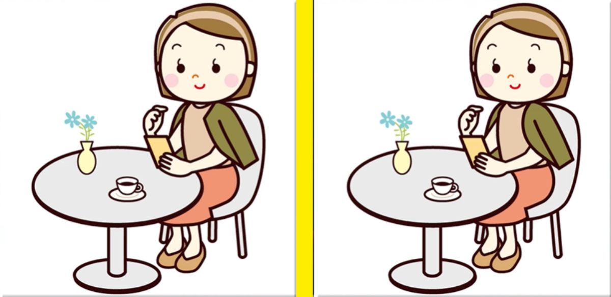 The image above depicts two identical pictures where you can see a lady sitting in a cafe. Although the images are nearly identical, there are 3 differences between them. Can you find them all in 8 seconds?
