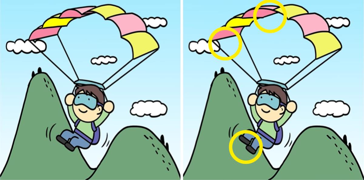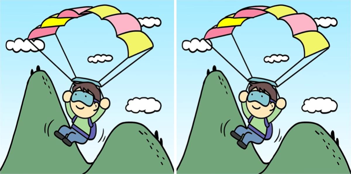 The image above depicts two identical pictures where you can see a man paragliding. Although the images are nearly identical, there are 3 differences between them. Can you find them all in 8 seconds?