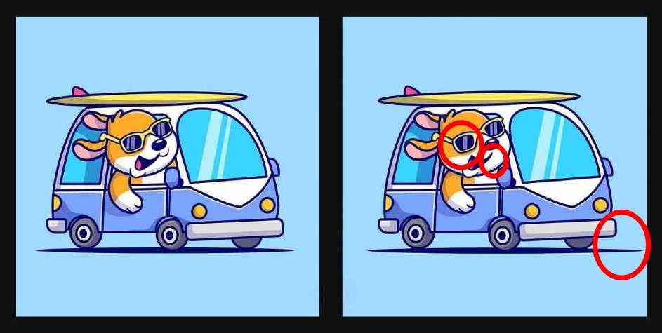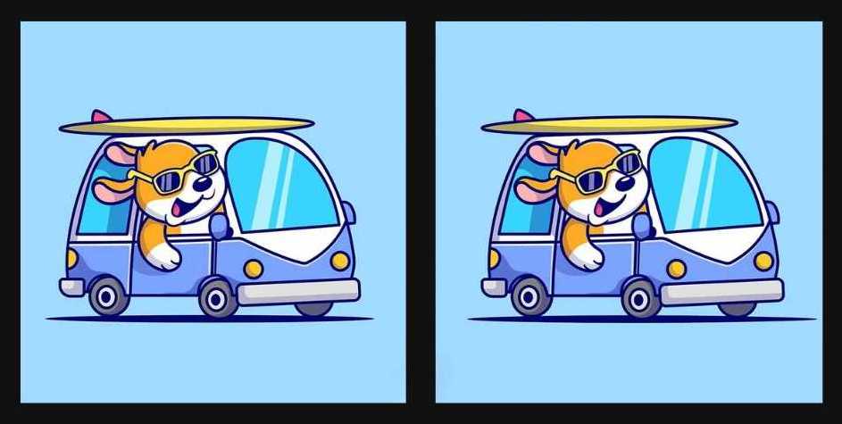 This spot the difference challenge features two identical pictures of a puppy driving a van. Although the two images look identical at first glance, they are not. There are three differences between the two pictures.