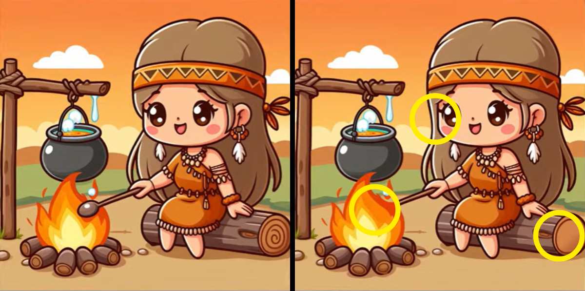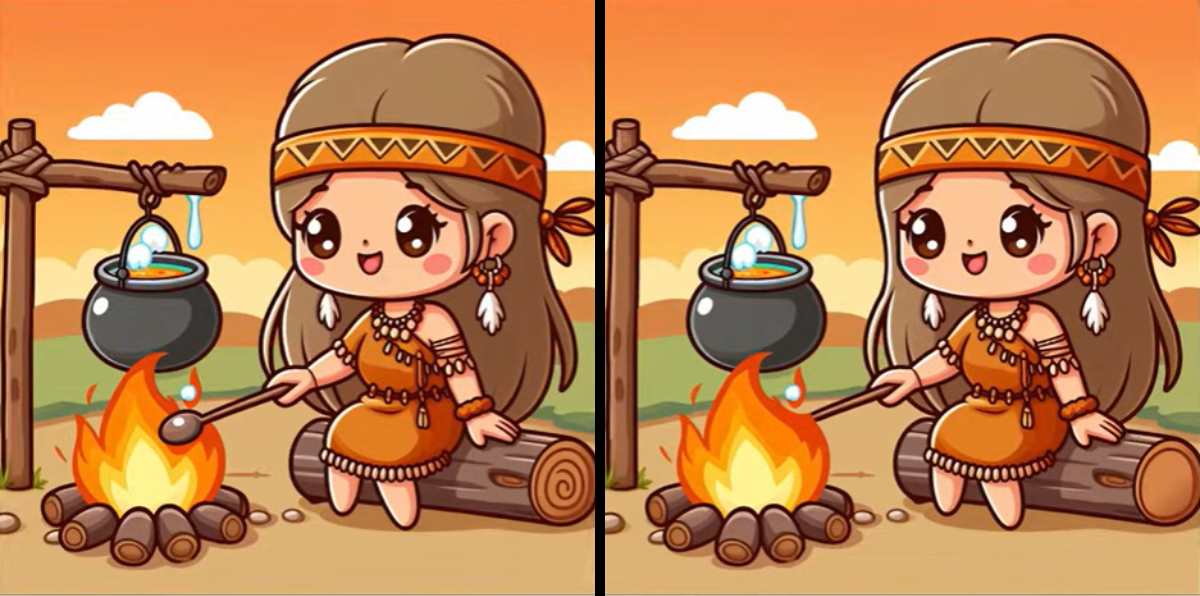 The image above depicts two identical pictures where you can see a tribal girl cooking food on a pot. Although the images are nearly identical, there are 3 differences between them. Can you find them all in 11 seconds?