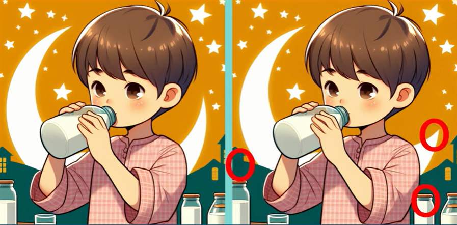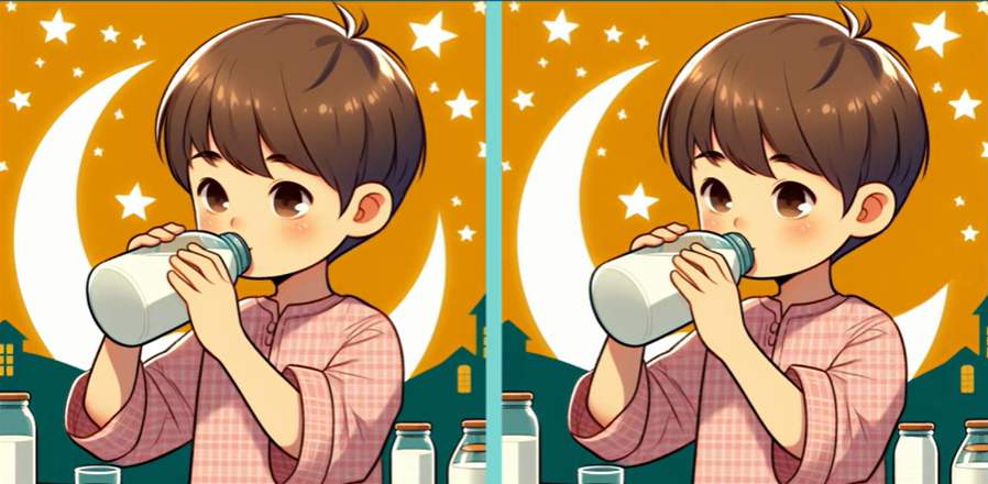 The image above depicts two identical pictures where you see a baby drinking a glass of milk. Although the images are identical, there are 3 differences between them. Can you find them in 15 seconds?