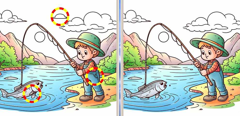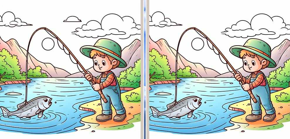 The image above depicts two identical side-by-side pictures where you can see a boy fishing in a pond. Although the images are nearly identical, there are 3 differences between them. Can you find them all in 12 seconds?