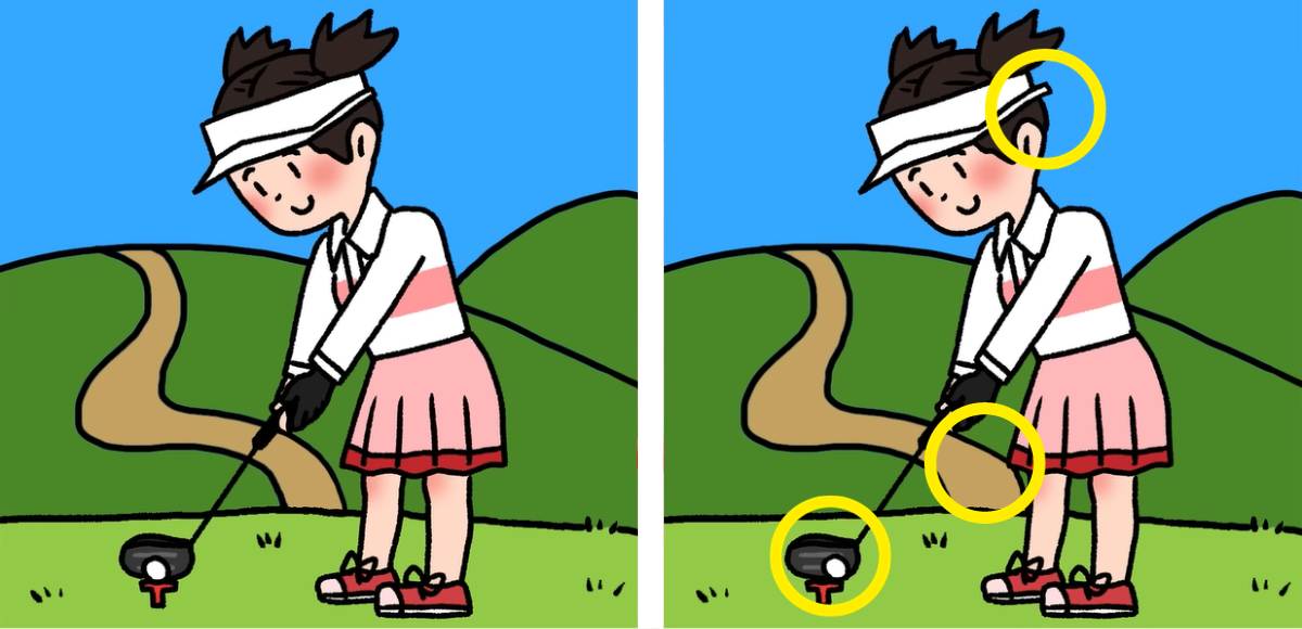 The image above depicts two identical pictures where you can see a girl playing golf. Although the images are nearly identical, there are 3 differences between them. Can you find them all in 9 seconds?