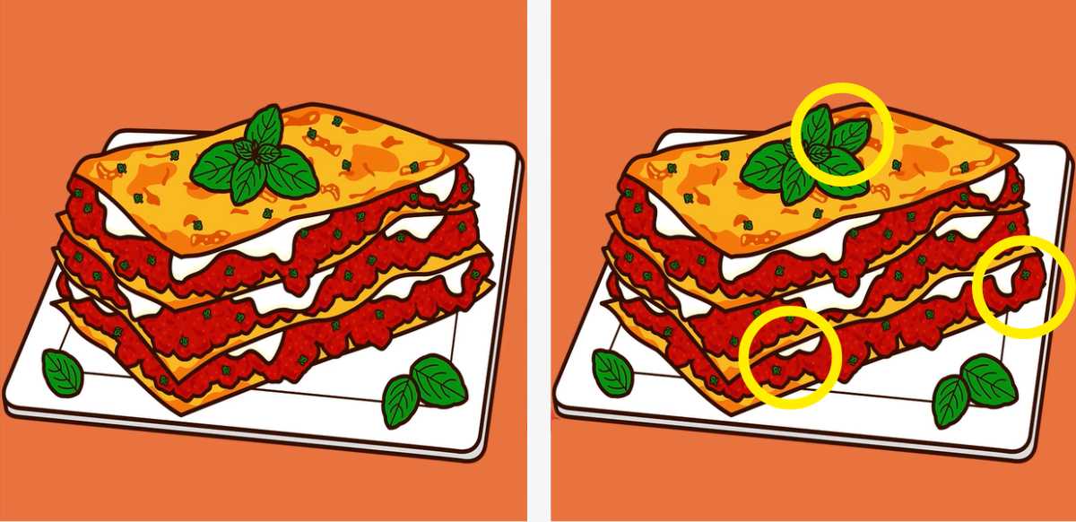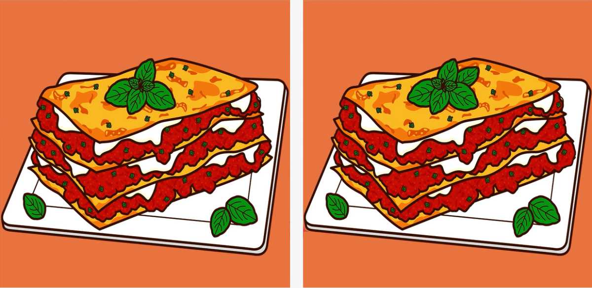 The image above depicts two identical pictures where you can see a delicious-looking lasagna served on a plate. Although the images are nearly identical, there are 3 differences between them. Can you find them all in 8 seconds?