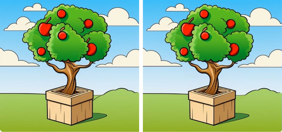 The image above depicts two identical side-by-side pictures where you can see an apple tree. Although the images are nearly identical, there are 3 differences between them. Can you find them all in 8 seconds?