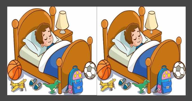 This spot the difference challenge features two identical pictures of a boy sleeping on a bed.