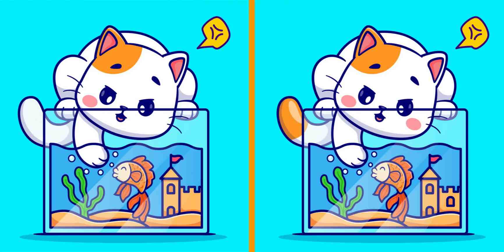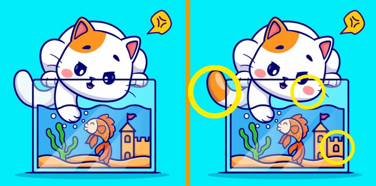 The image above depicts two identical pictures where you can see a cat putting her paw inside a fishbowl where you can see a fish swimming. Although the images are nearly identical, there are 3 differences between them. Can you find them all in 7 seconds?