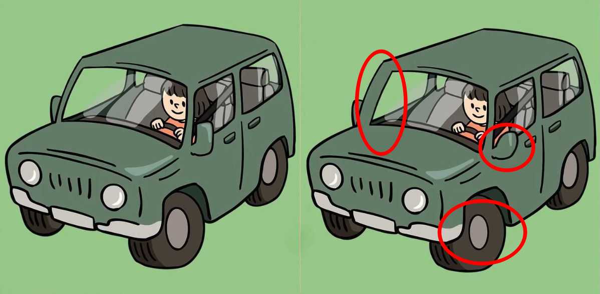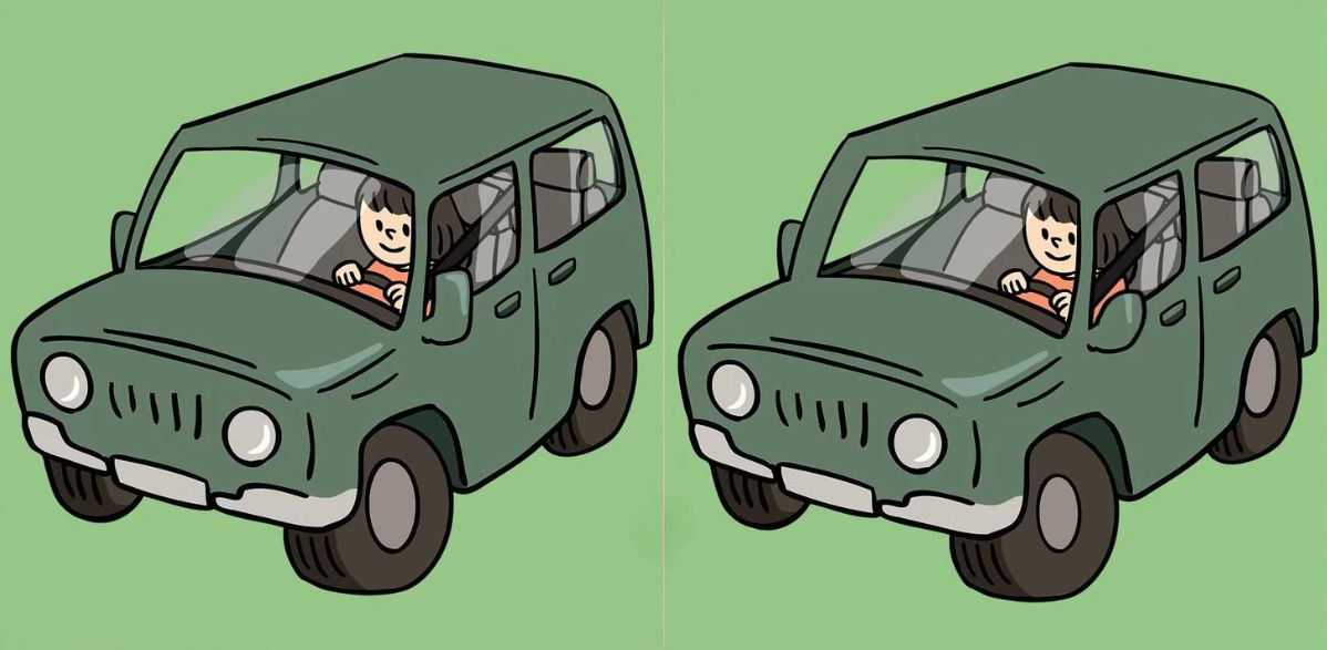 This spot the difference challenge features two identical pictures of a girl driving a jeep. Although the two images look identical at first glance, they are not. There are three differences between the two pictures.
