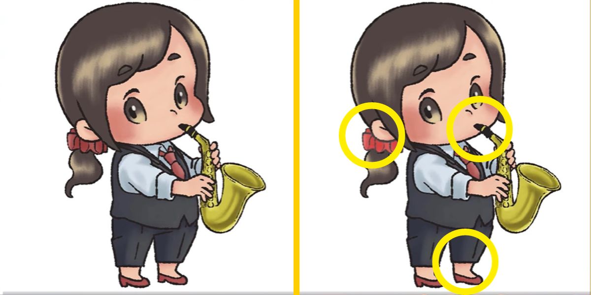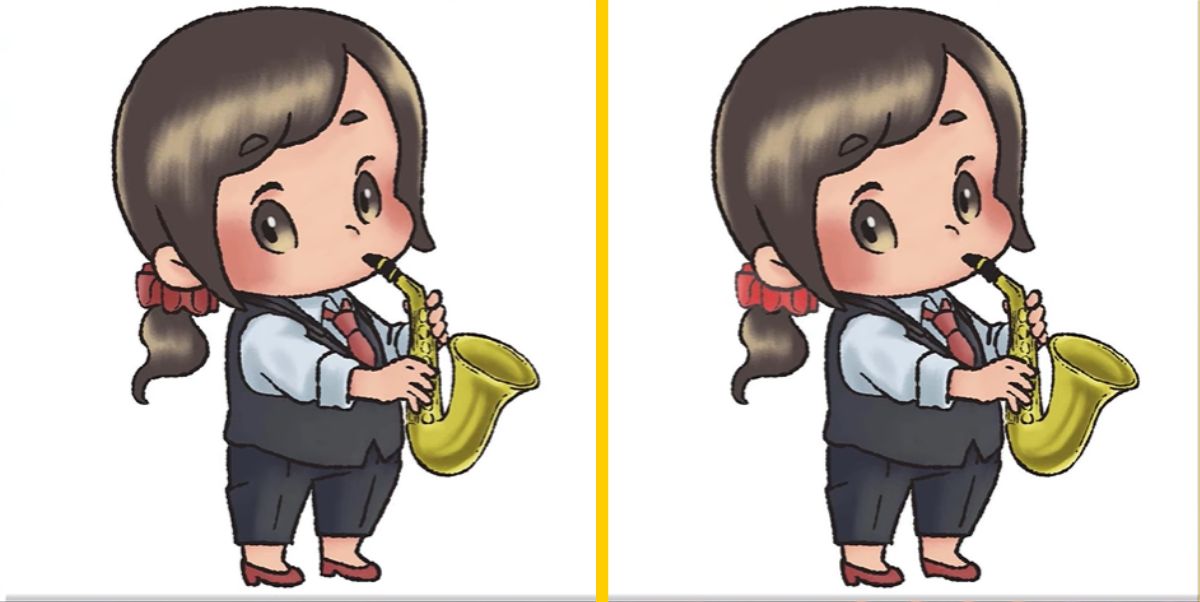 The image above depicts two identical side-by-side pictures where you can see a girl playing the trumpet. Although the images are nearly identical, there are 3 differences between them. Can you find them all in 7 seconds?