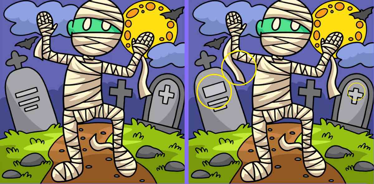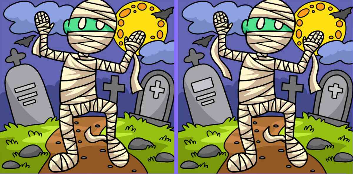 The image above is of a mummy that has risen from the dead. You can see the moon that is made from cheese, there are bats flying high in the sky. The mummy is walking in the graveyard. Now, the two images may look undistinguishable, but there are 3 differences between the two. You have to find them all within the given time. Oh and you only have 9 seconds to find all of the differences. If you are unable to identify the differences, don't worry because we are about to give you the solution to this spot the difference puzzle. Scroll down to see it.