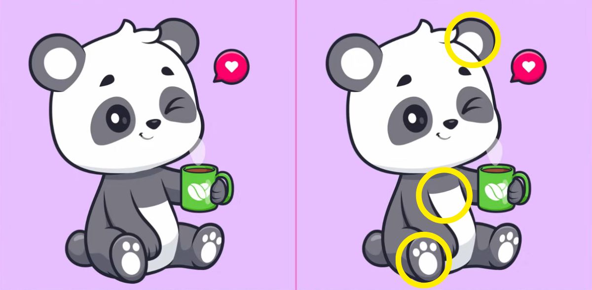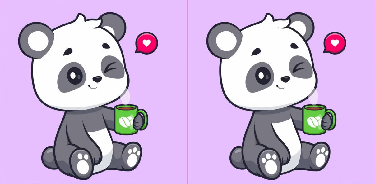 The image above depicts two identical side-by-side pictures where you can see a panda drinking coffee. Although the images are nearly identical, there are 3 differences between them. Can you find them all in 7 seconds?