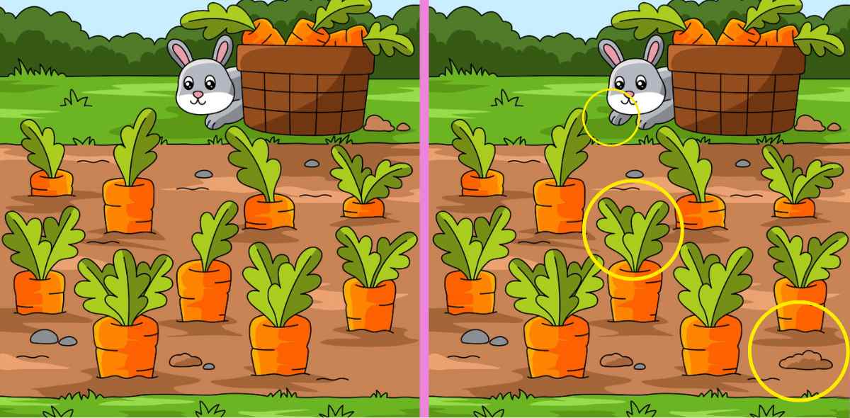 The above are two identical images of a rabbit in a garden of carrots. Our adorable little rabbit is hiding behind a basket full of carrots, overlooking the ones that are still planted in the garden. Yes, we know that the bunny is a little too adorable, but do not deviate from the problem at hand. The above two images are identical, except for three differences between the two. Can you find the differences in just 13 seconds? We are counting on you. You know the drill. Go ahead and grab your smartphone and/or smartwatch, and set a timer for 13 seconds. Your time starts now. All the best, guys.