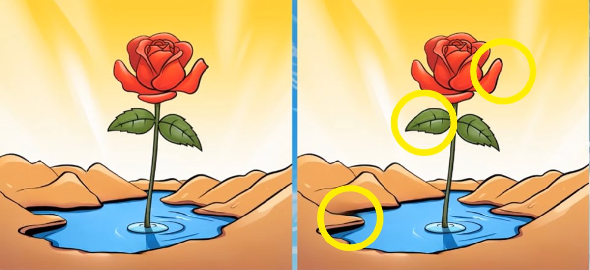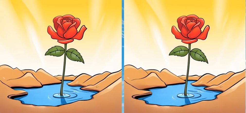 The image above depicts two identical pictures where you can see a fully blossomed rose. Although the images are nearly identical, there are 3 differences between them. Can you find them all in 9 seconds?