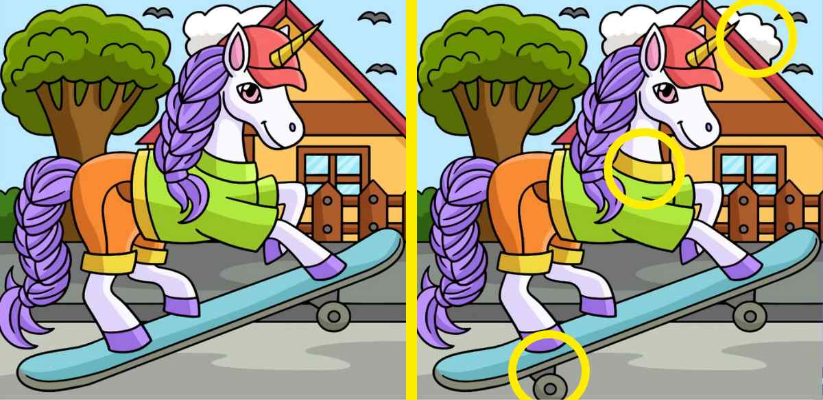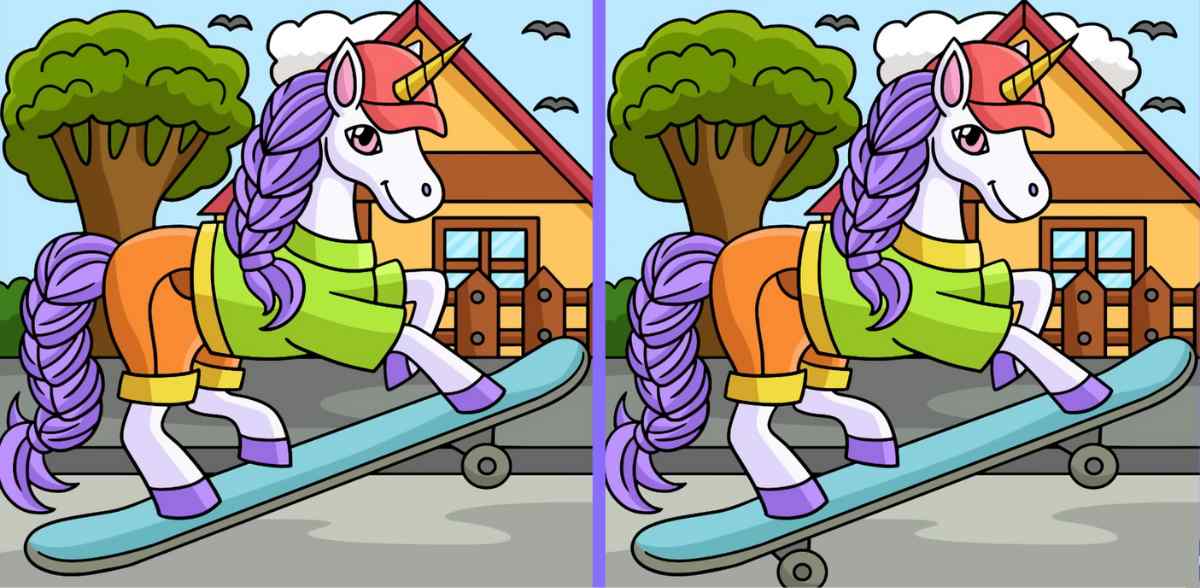 The image above depicts two identical pictures where you can see a unicorn skateboarding on the street. Although the images are nearly identical, there are 3 differences between them. Can you find them all in 8 seconds?