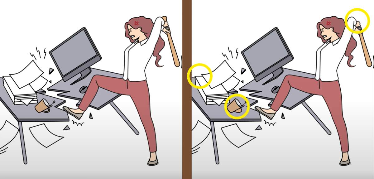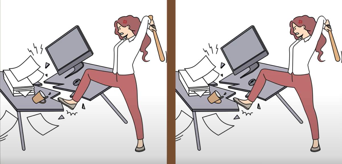 The image above shows two identical side-by-side images of a woman holding a baseball bat. She looks furious and can be seen breaking her workstation. The desk she is breaking has a monitor and a stack of paper on it and it’s been broken in half. Although the images are almost exactly the same, there are three differences between the two. Can you find all of them in 9 seconds?