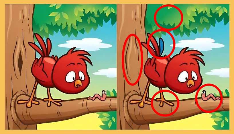This spot the difference challenge features two identical pictures of a bird sitting on a tree branch. Although the two images look identical at first glance, they are not. There are five differences between the two pictures.