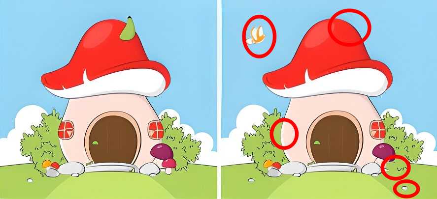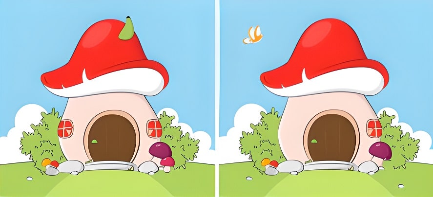 In this spot the difference challenge, two identical pictures of a mushroom house are seen.