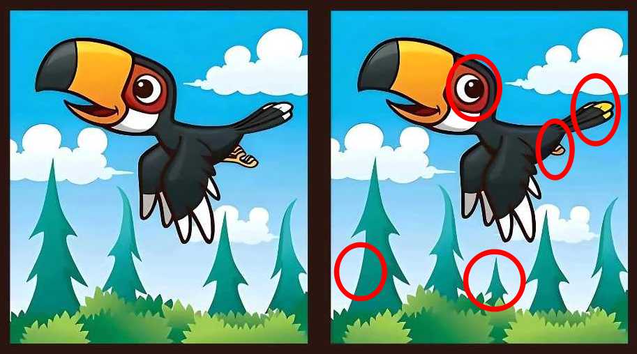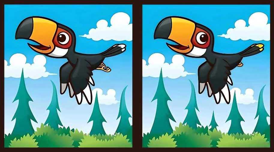 This spot the difference challenge features two identical pictures of a toucan. Although the two images look identical at first glance, they are not. There are five differences between the two pictures.