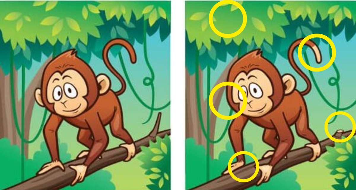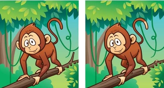 The image above depicts two identical pictures where you see a monkey sitting on a tree. Although the images are identical, there are 5 differences between them. Can you find them all in 19 seconds?