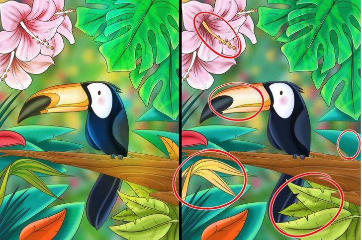 The image above shows two identical pictures of a toucan sitting on a tree. Despite the fact that the pictures are practically identical, there are five differences between them. Can you find all of them in 25 seconds?