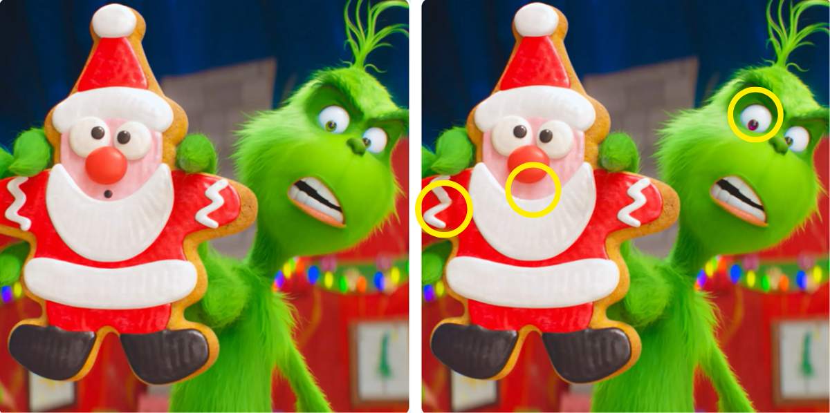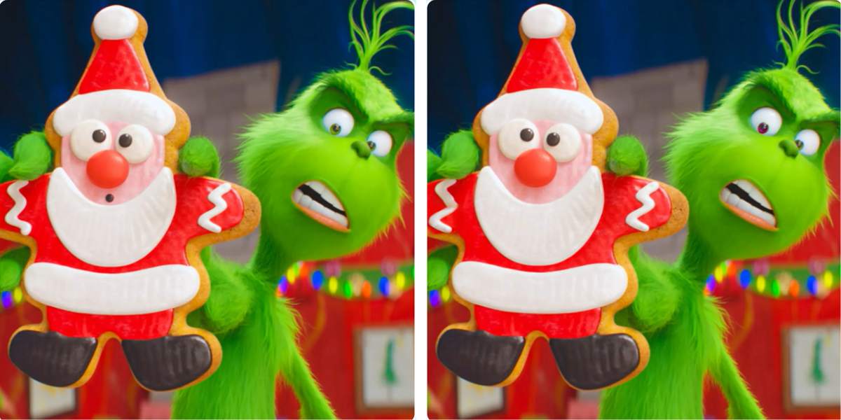 In the image above, you can see two side-by-side pictures of the Grinch, who hates Christmas. He is holding a Santa cookie and looks absolutely disgusted. The two images are almost identical; however, there are three differences between the two. Now, it is up to you to spot them all. Can you do so in 10 seconds?