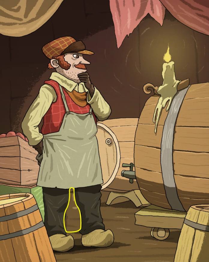 In this brain teaser picture puzzle, you can see a man standing in a storage room. The man has lit a candle because the space is dim and filled with wine barrels. He is searching for something in particular—a bottle. The man is looking for his lost bottle, which he believes to be somewhere in the storage area.