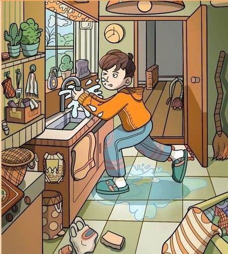 You can see a kitchen in this picture. The kitchen is unkempt, and you can see a boy doing the dishes. There is a puzzle of water underneath his feet, and there are a lot of things scattered in the kitchen. And if you take a closer look at the state of this kitchen, you will notice that there is something in there that does not belong there. Yes, you guessed it. There is a crown hidden in the kitchen in this visual puzzle test. Will you be able to spot it? Within the given time?