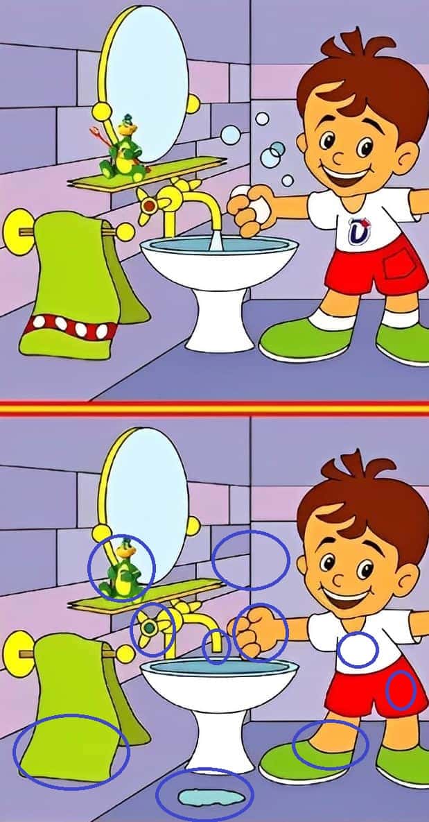 The image shown above depicts a washroom scene in which a boy can be seen washing his hands. There are 10 differences between the two images, and you have 27 seconds to find them.