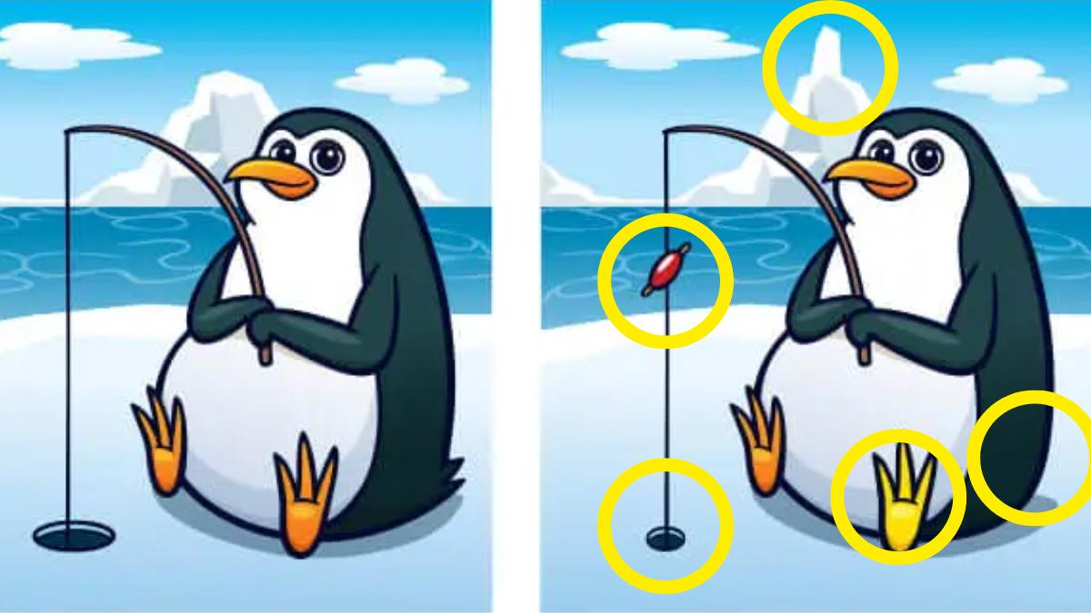 The image above depicts two identical pictures where you can see a penguin fishing for food. Although the images are identical, there are 5 differences between them. Can you find them all in 15 seconds?