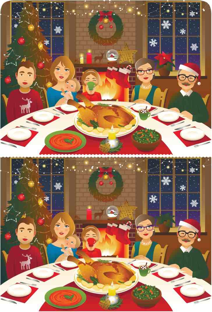 The image above depicts two identical pictures where you see a family eating dinner together. Although the images are identical, there are four differences between them. Can you find them in 16 seconds?