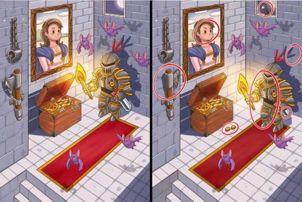 The image above depicts two identical pictures where you see a royal treasury. Although the images are identical, there are 7 differences between them. Can you find them all in 21 seconds?