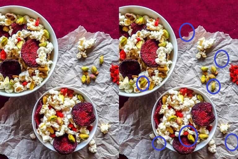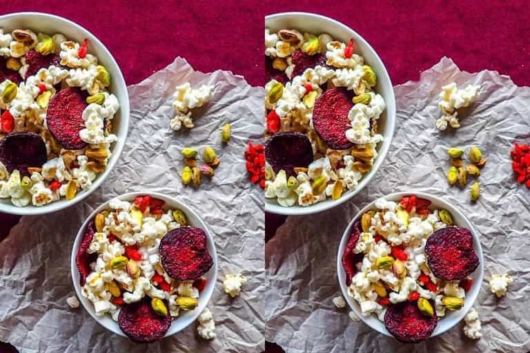 The image shared above depicts two identical images where you can see two bowls filled with popcorn, pistachios and dried beetroots.