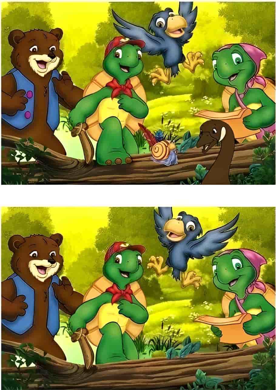 In the image shared above, you can see a forest scene where a bear, two turtles and a bird can be seen.