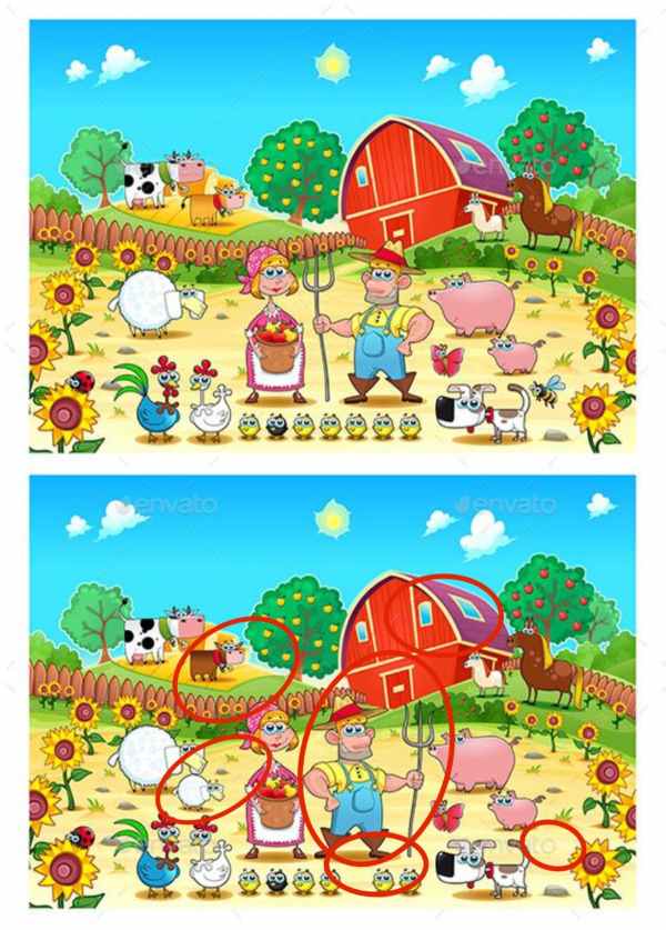 The image below features a couple with their farm and animals. Your challenge is to find the six hidden differences between the two images in 25 seconds.