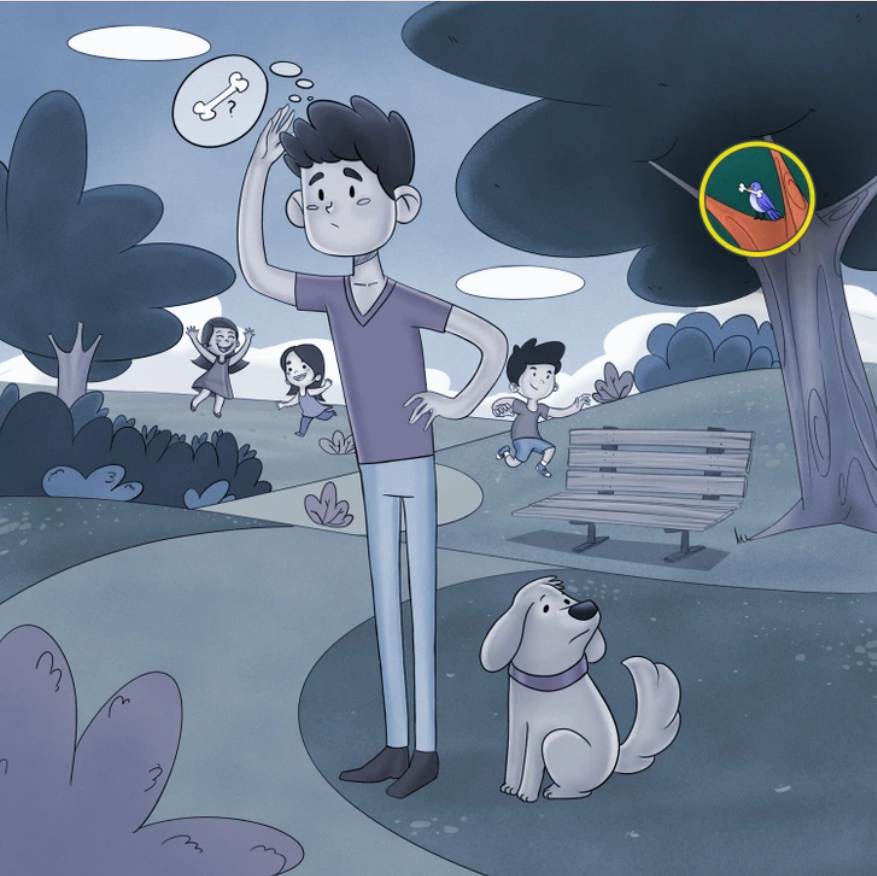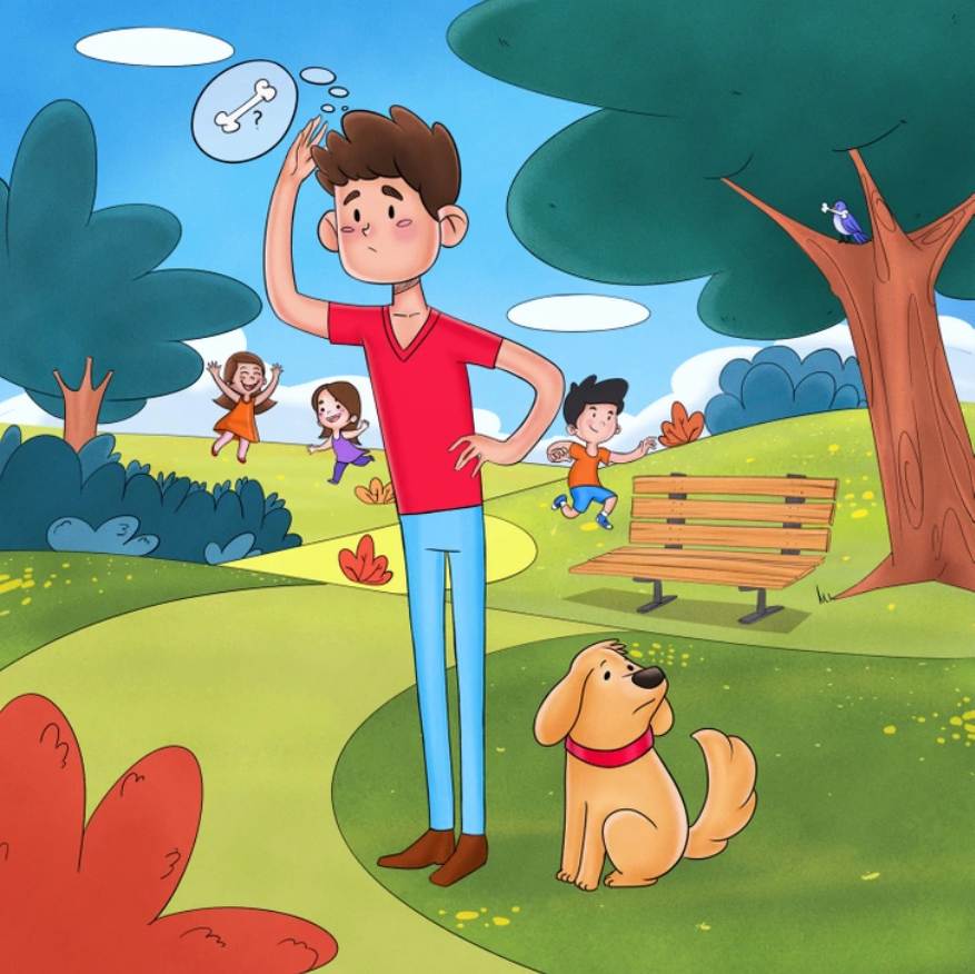 In the image above, you can see a park in view. There is a man walking his adorable dog, and children are playing in the park. If you look at the dog, you will see that he looks quite upset. The poor dog has lost his toy bone somewhere in the park. It was his favourite toy, and his owner is also unable to spot it anywhere. Can you help the poor dog find his favourite toy? He will be very happy if you do. Yes? We knew you were a good person. As usual, there is a time limit set for this puzzle as well. You have only 4 seconds to spot the hidden bone. Set your timers and begin the challenge. Your time starts now. All the best!