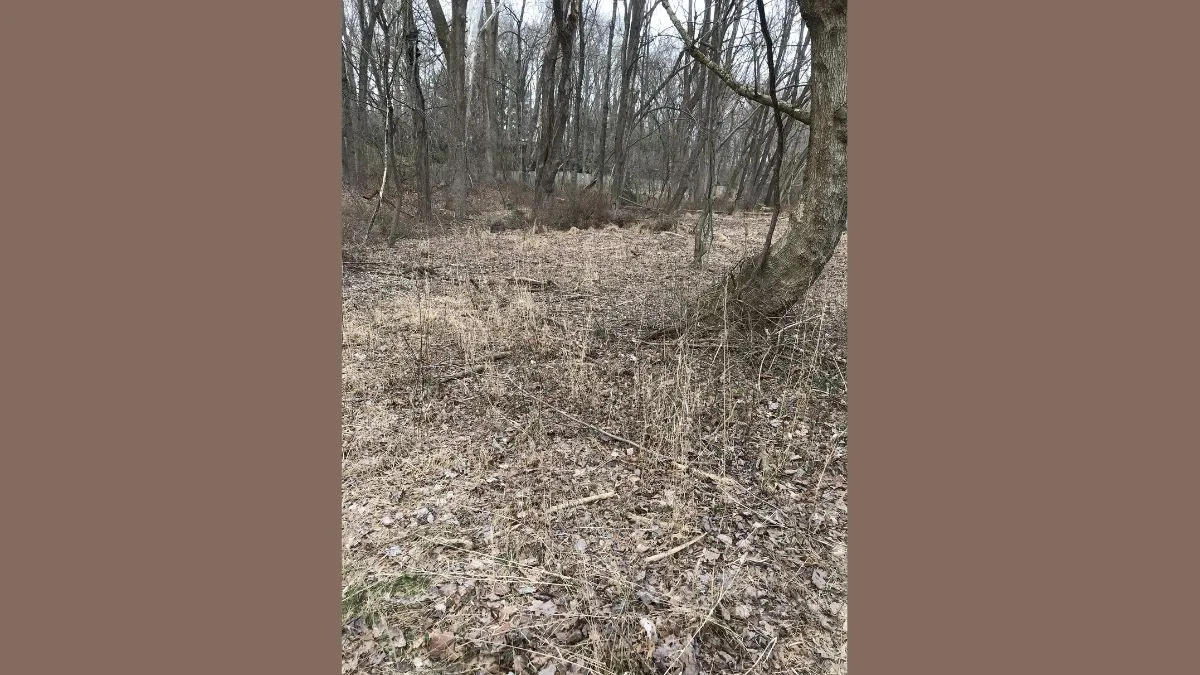 Many trees have shed their leaves, and the ground is covered with dry leaves, twigs, and sparse grass.