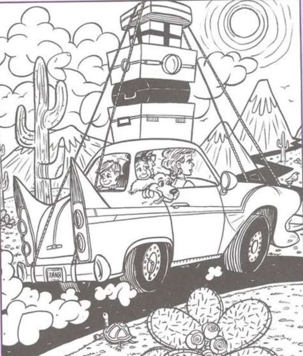 The image features a family going for a vacation. There are a number of things that can distract you from finding the clock, such as the closely knit objects.