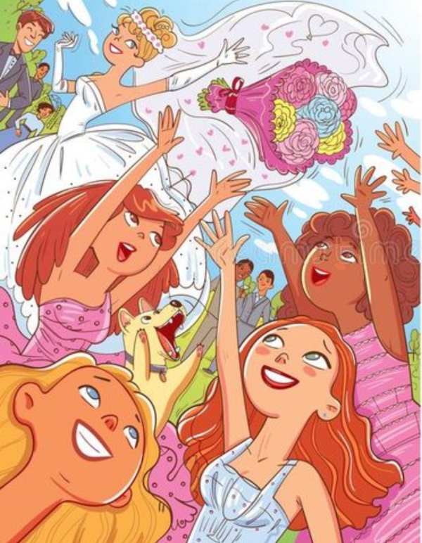 The above image shows a bride tossing a bouquet and the bridesmaids are trying to catch it.