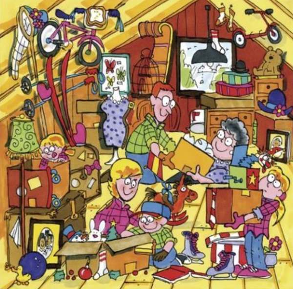 The image features children helping in packing and it looks very chaotic. There are a number of things that can distract you from finding the skateboard.