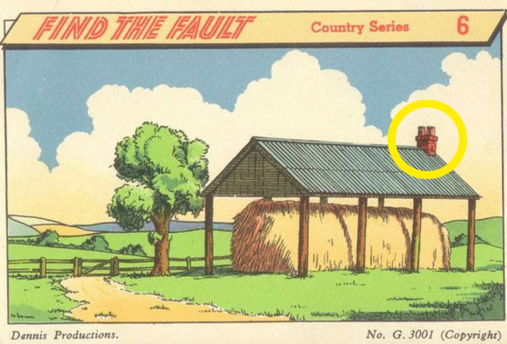You were asked to spot the mistake in the barn pictures. At the top of the structure, you can see a chimney when it does not need one. Take a look at it for yourself.