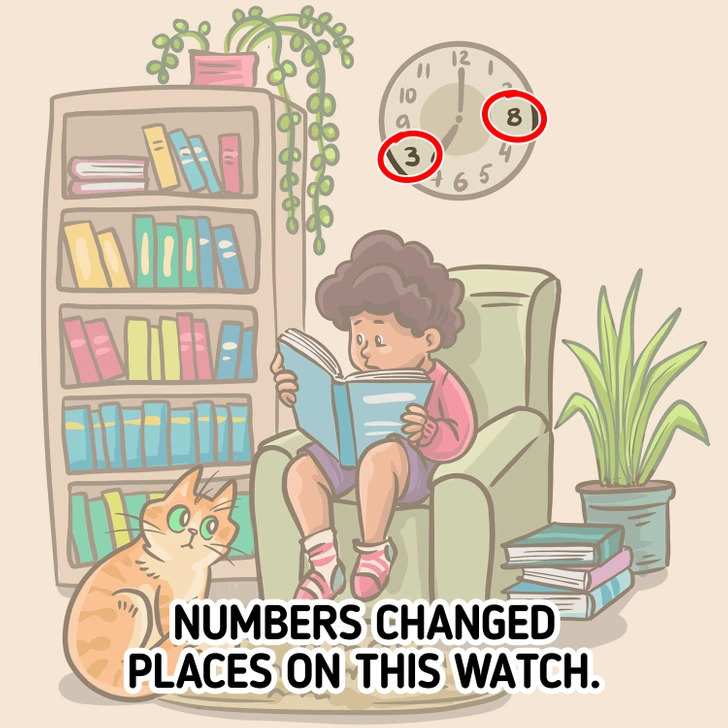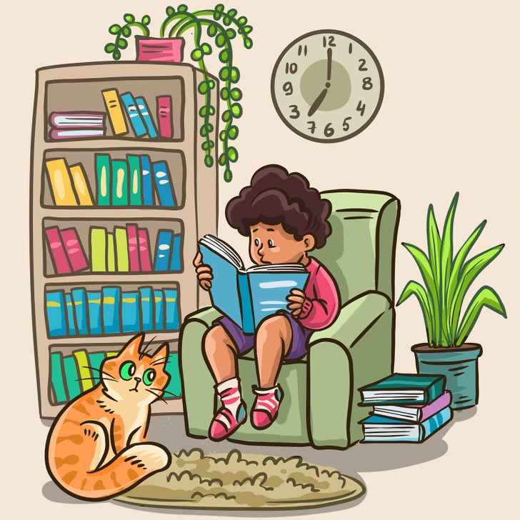 In this picture puzzle above, you can see a boy reading a book. The boy seems to be sitting in the living room of his house. He is perched up on the sofa and reading the book intensely. There is a bookshelf and there is a stack of books on the ground as well. There is also a cute cat sitting on the rug. The image may look innocent and normal at first glance, but you if you take a closer look at this brain teaser picture puzzle, you will find that there is something wrong with this brain puzzle. Now it if your task to spot the mistake in this brain puzzle. The time limit set for this puzzle is 6 seconds. Set your timers and get started.