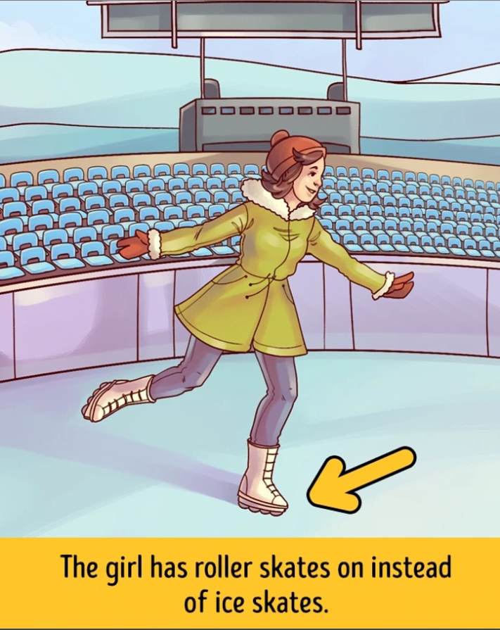 In the above image, you can see a woman skating in an ice skating rink. The skating rink is empty except for the woman. Now, at first glance, you will not notice anything unusual in this picture puzzle. However, if you take a closer look, you will notice that there is a significant mistake in the puzzle. Can you spot the mistake in the given time?
